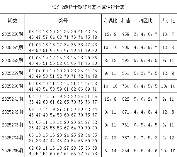 韩侠快乐8第2025266期奖号属性分析