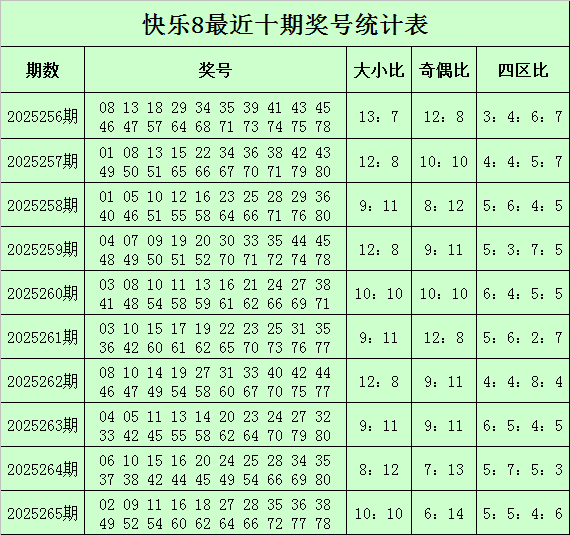 福彩快乐8第2025265期开奖回顾:02 09 11 16 18 27 28 35 36 38 49 52 54 60 62 64 66 72 77 78,其中奖号四区比为5:5:4:6,奇偶比为6:14,大小比为10:10。
